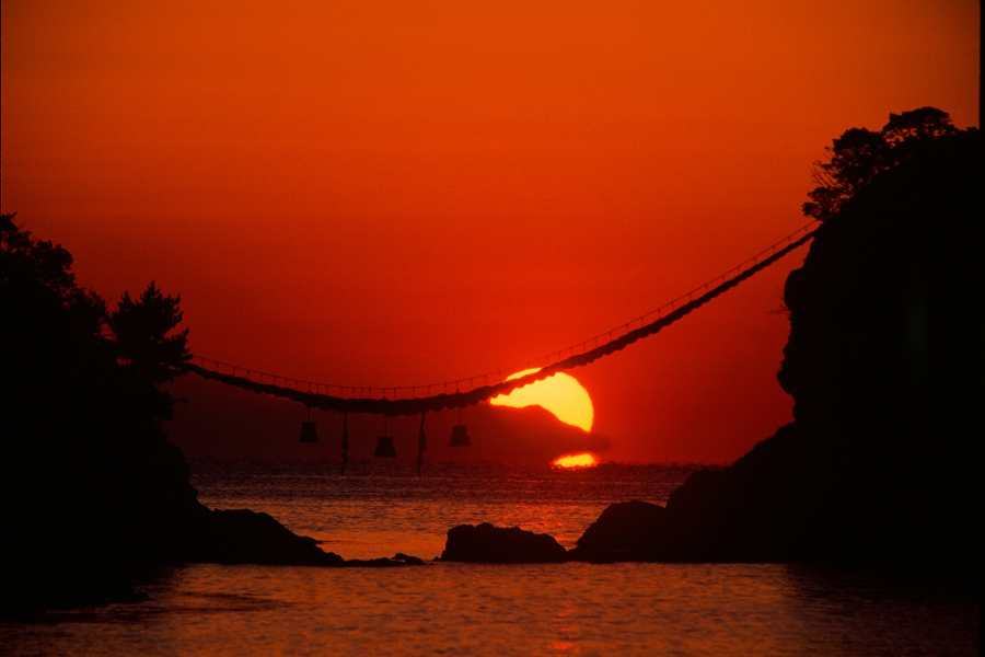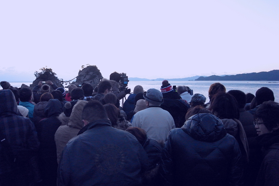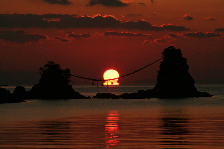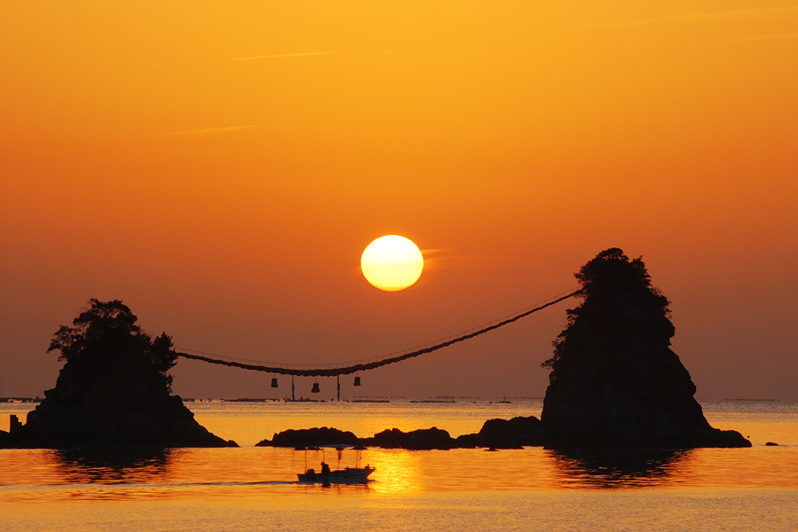 夫婦岩の真ん中から日の出が上がり、正面から撮影するには最適の時が年に2回あります。