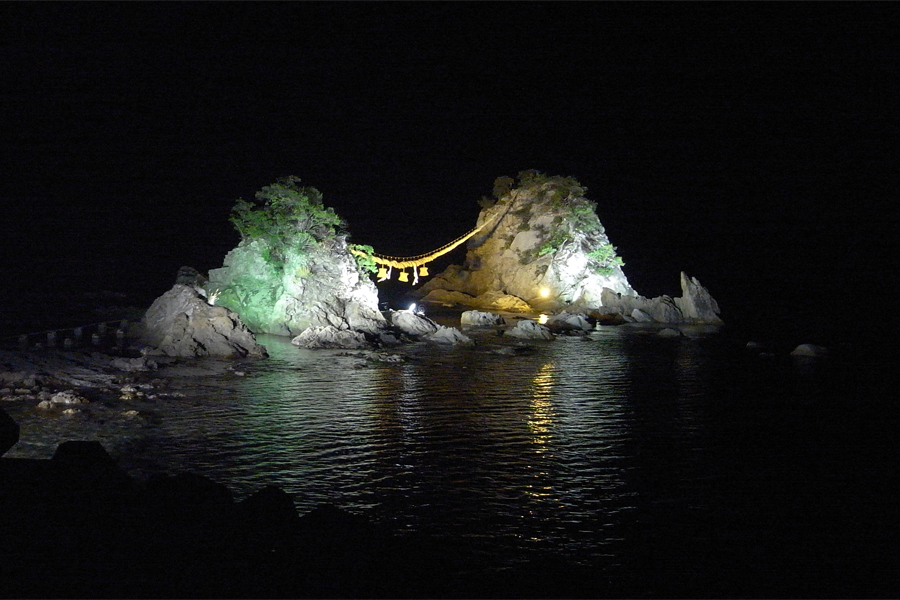 豊後二見ヶ浦のライトアップは、12月24日から翌年 1月 4日まで。初日の出以外にも、3月または10月の夫婦岩の間から昇る日の出や、年末年始のライトアップされた姿も印象的です。