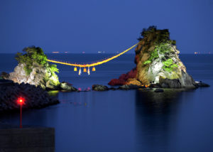 豊後二見ヶ浦夫婦岩の間から昇る日の出や、年末年始のライトアップされた姿も印象的
