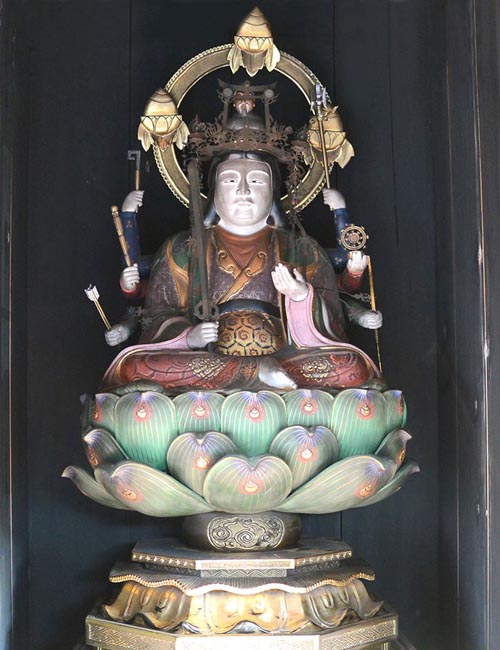 八本の腕には、弓、力、剣、斧などを携えていて、頭上には日本古来からの穀物神「宇賀神(うがじん)」と蛇がおり、豊穣、財運と結びついた神様です。