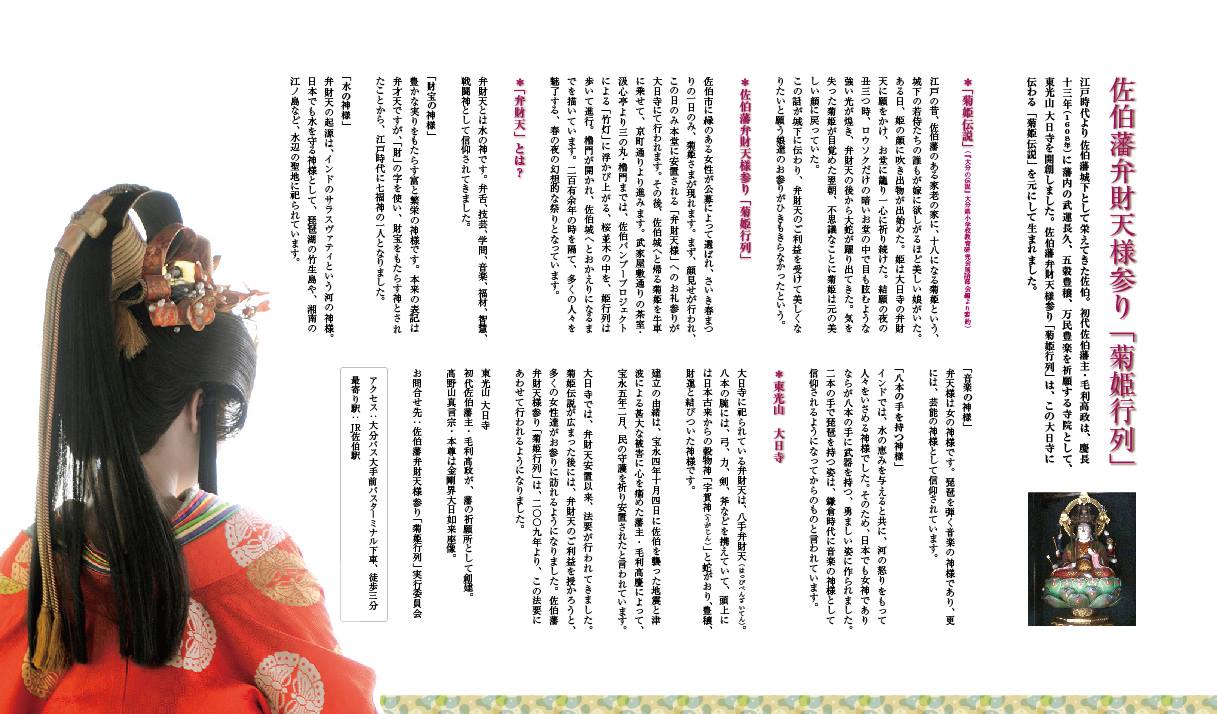 佐伯市に縁のある女性が公募によって選ばれ、さいき春まつりの一日のみ、菊姫さまが現れます。まず、顔見せが行われ、この日のみ本堂に安置される「弁財天様」へのお礼参りが大日寺にて行われます。