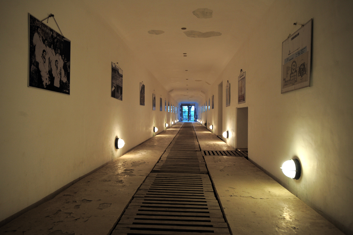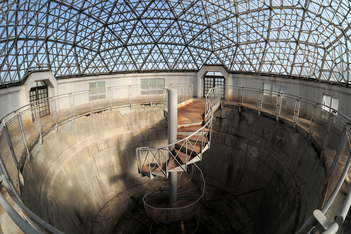 中央のらせん階段を上るとコンクリートに刻まれた爆発事故の痕跡がよく見えます。