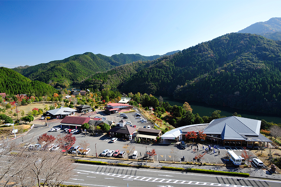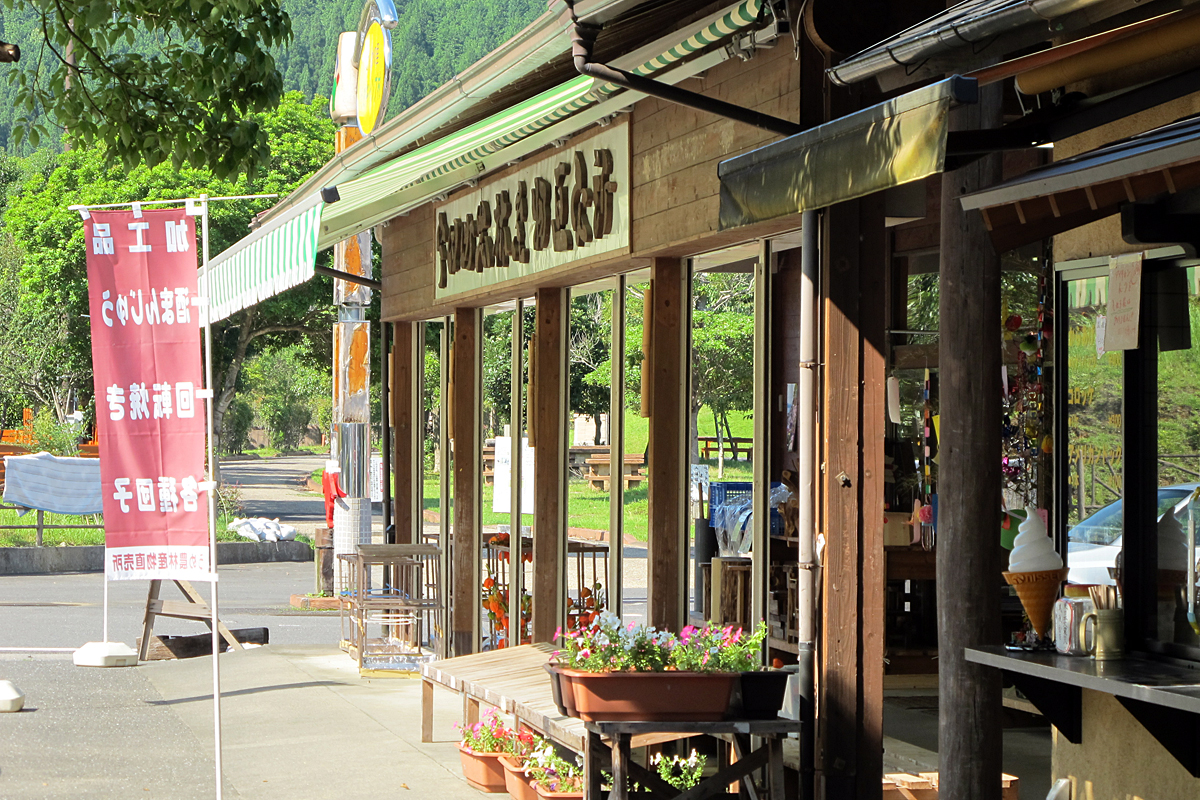 道の駅宇目内の「レストハウス うめりあ」は、ウッディな外観が周囲の緑と調和した水辺...
