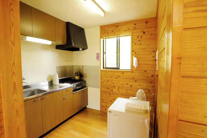 各ケビンは、トイレ・シャワー付きお風呂・キッチン・冷蔵庫・エアコン(コイン式)など、充実した設備を誇ります。炊事用具や食器、寝具までそろっています。