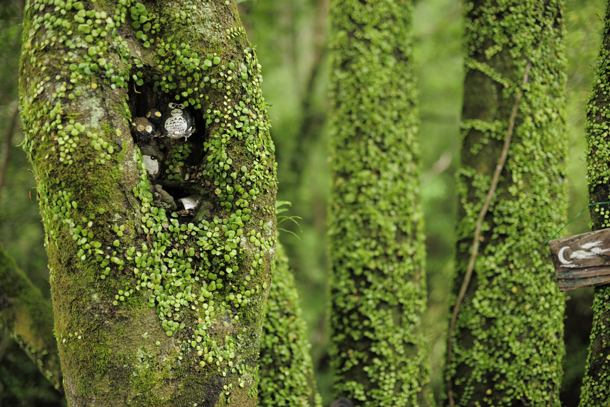 ととろのバス停から少し離れた場所に、「ととろの森」があります。木の枝などに沢山の小さなトトロが並んでいます。