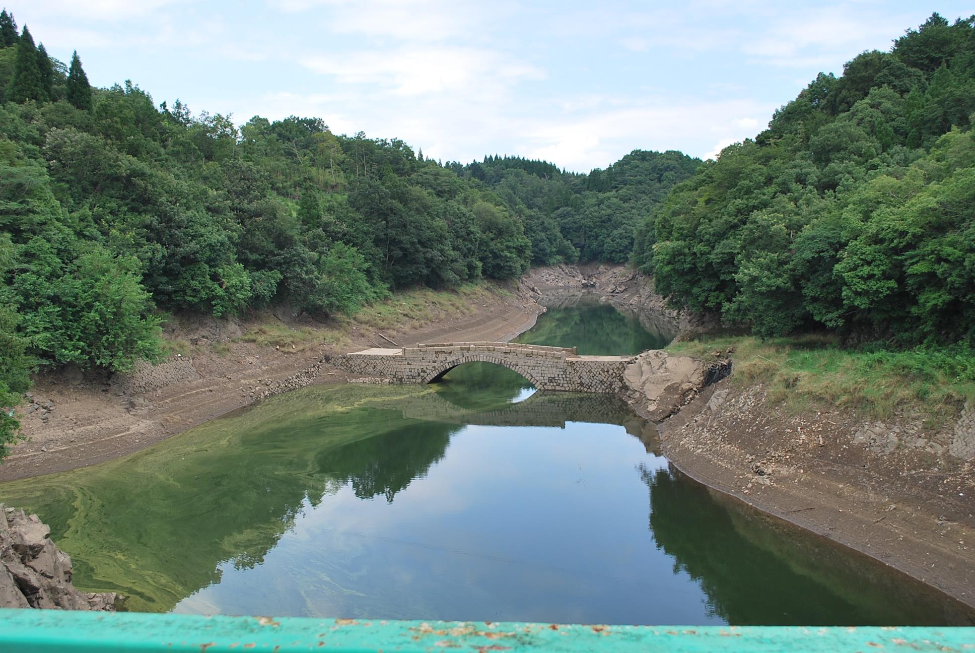 湖の影響で水量の少ない時期だけ、水面から顔を出すが、渇水期のみ姿を現す石橋として有名である。