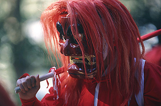 火の神様、荒神の赤い面や衣装は木浦鉱山で産出していたスズの紅色鉱の多産を願ってとのこと。