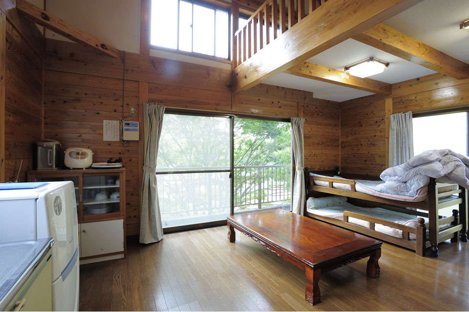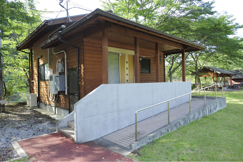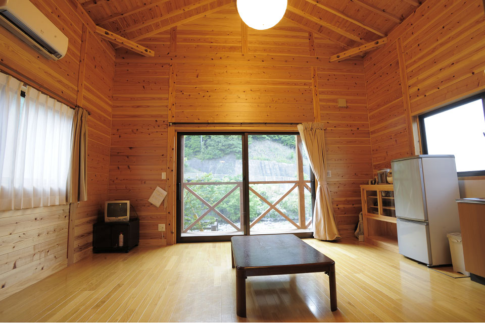 直川憩の森公園キャンプ場には8名用のバンガロー(全8棟)、5名用のバンガロー(全5棟)、そして定員40名の大型バンガローがあります。