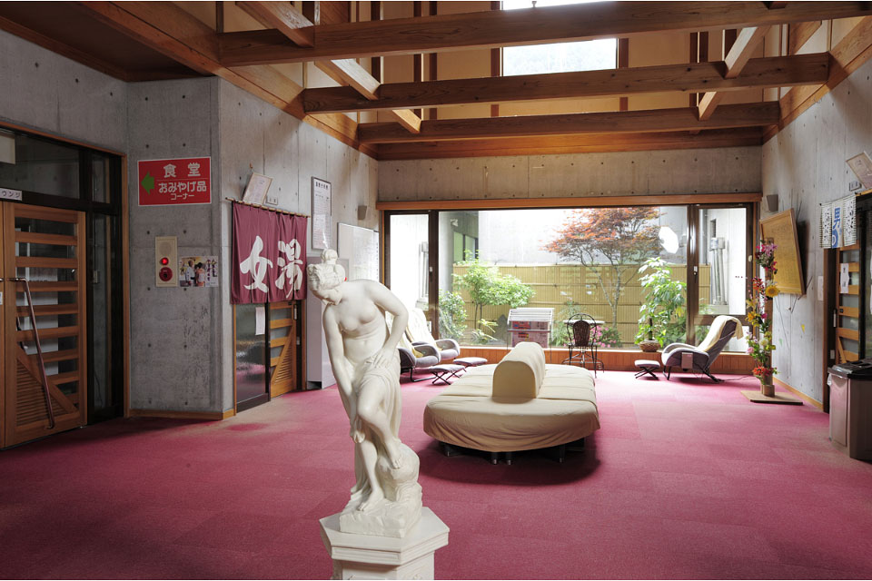 広々とした浴場に気泡湯、冷泉風呂、ジェットバス、サウナなどがあります。浴槽は黒大理石、天井は直川特産の直見杉を使用。館内には休憩室や喫茶室があり、ゆっくりくつろいでいただけます。